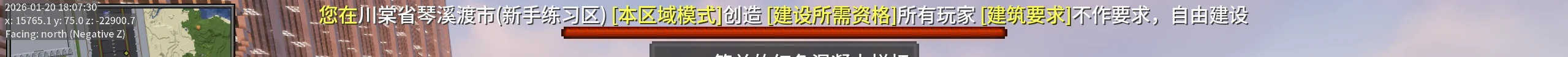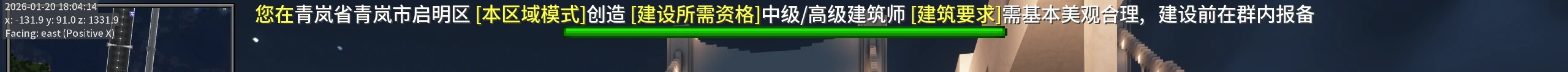 5.游玩时,请注意管理员告知您的建设资格等级以及注意查看您当前所在的区域。当前区域以及当前区域的建设资格和要求会在游戏界面的上方显示: